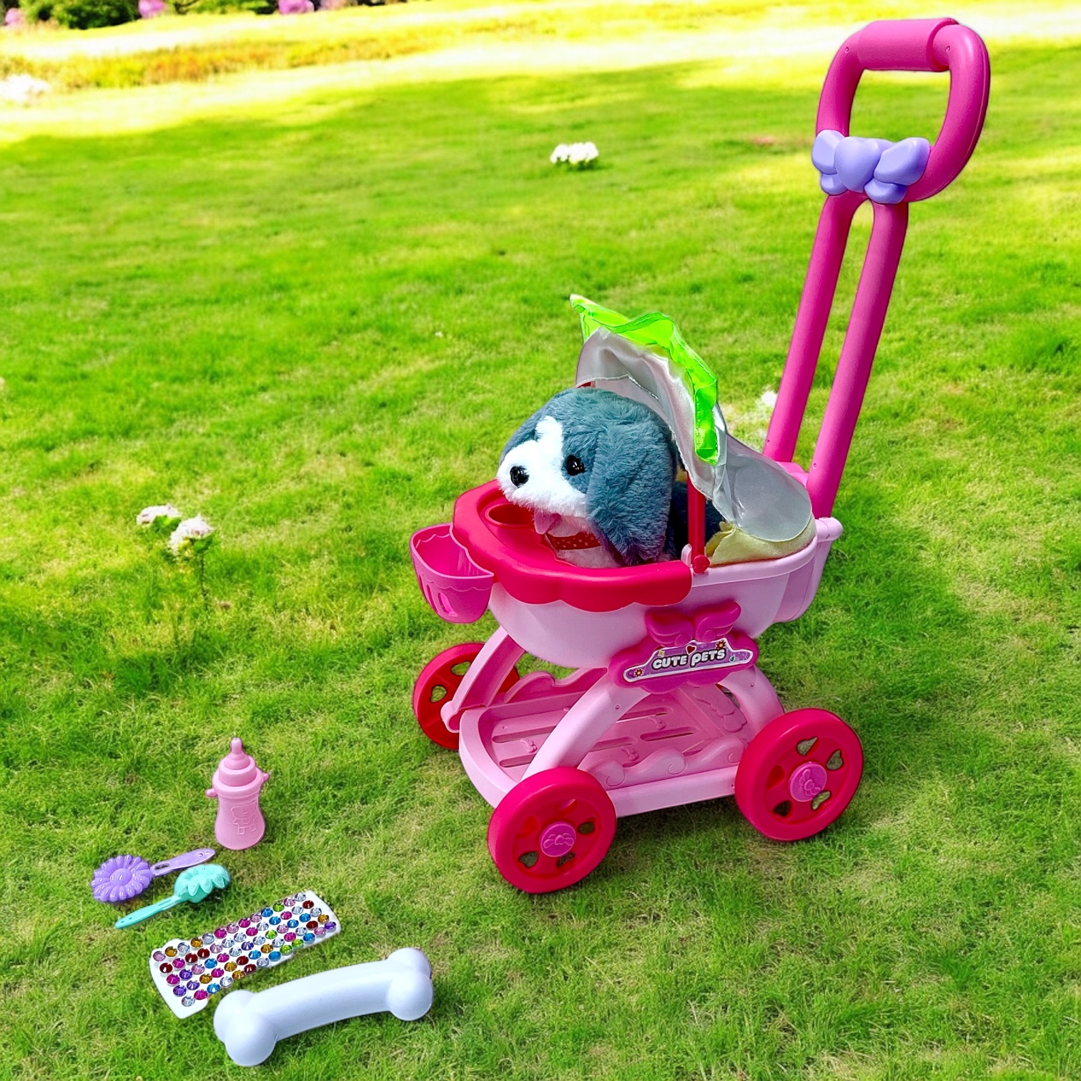 - This play pet veterinary set is a 17 pieces with a Plush Dog, Carrying Case, stethoscope, eyeglasss, bone*3, otoscope, syringe, thermometer, hair dryer, comb, pill *2 , scissors,…