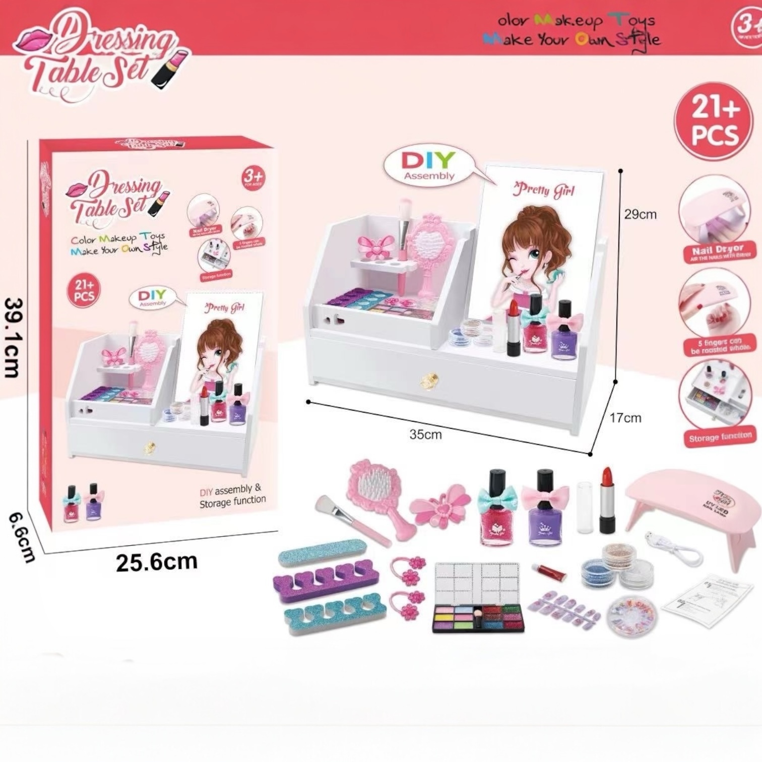 تسريحة مكياج للأطفال مصنوعة من الخشب مزودة بمرآة، مع مكياج وأدوات تجميل للعب آمن وممتع، تساعد طفلتك على تقليد الكبار وتنمية خيالها