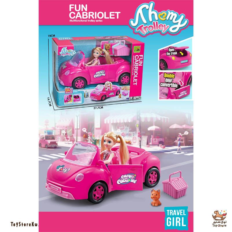 سيارة النزهة مع الدمية الجميلة بلون الوردي المميز و الرائع مع كلب لطيف و حقيبة الرحلة