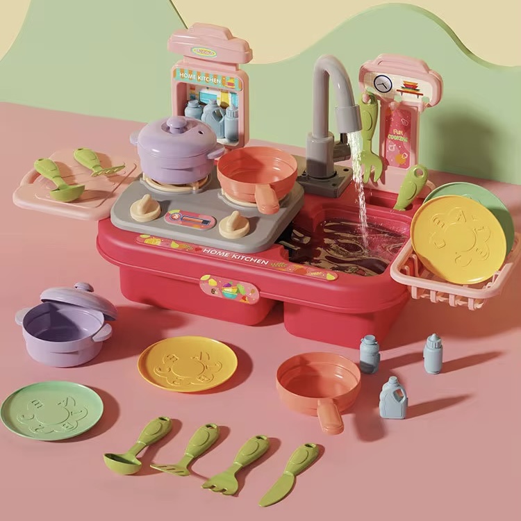 صنبور المياه التفاعلي: يحتوي المطبخ على صنبور مياه يعمل على البطارية، مما يجعل الأطفال قادرين على تشغيل الماء بسهولة مثل الصنابير الحقيقية. أدوات المطبخ المصغرة: تأتي مع ألعاب طبخ صغيرة مثل المقلاة، الأطباق، الأدوات المطبخية الأخرى التي تمنح الطفل تجربة طهي واقعية. حوض غسيل صغير: يحتوي المطبخ على حوض صغير يمكن للطفل غسل الأطباق أو اللعب بتصريف المياه فيه