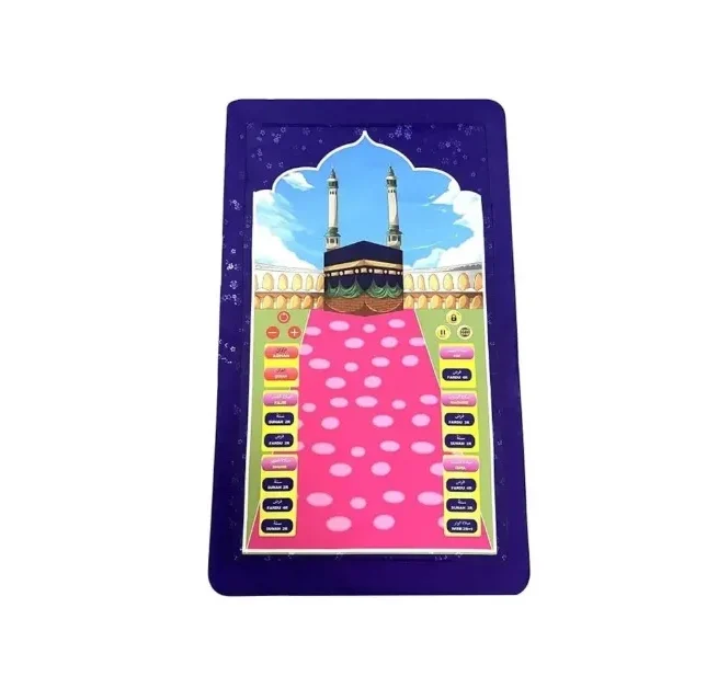 سجادة مصممة لتعليم الأطفال كيفية أداء الصلاة خطوة بخطوة بطريقة ممتعة وسهلة وتفاعلية. المقاس: 100×60 سم. تدعم 10 لغات: الإنجليزية، العربية، الفرنسية، الملايوية، الإندونيسية، الأردية، الروسية، الأوزبكية، التركية، والكردية. تتفاعل سجادة الصلاة مع اللمس وتحتوي على مفاتيح يمكن لمسها للكشف عن الأصوات، مثل الأذان، ومواقيت الصلاة