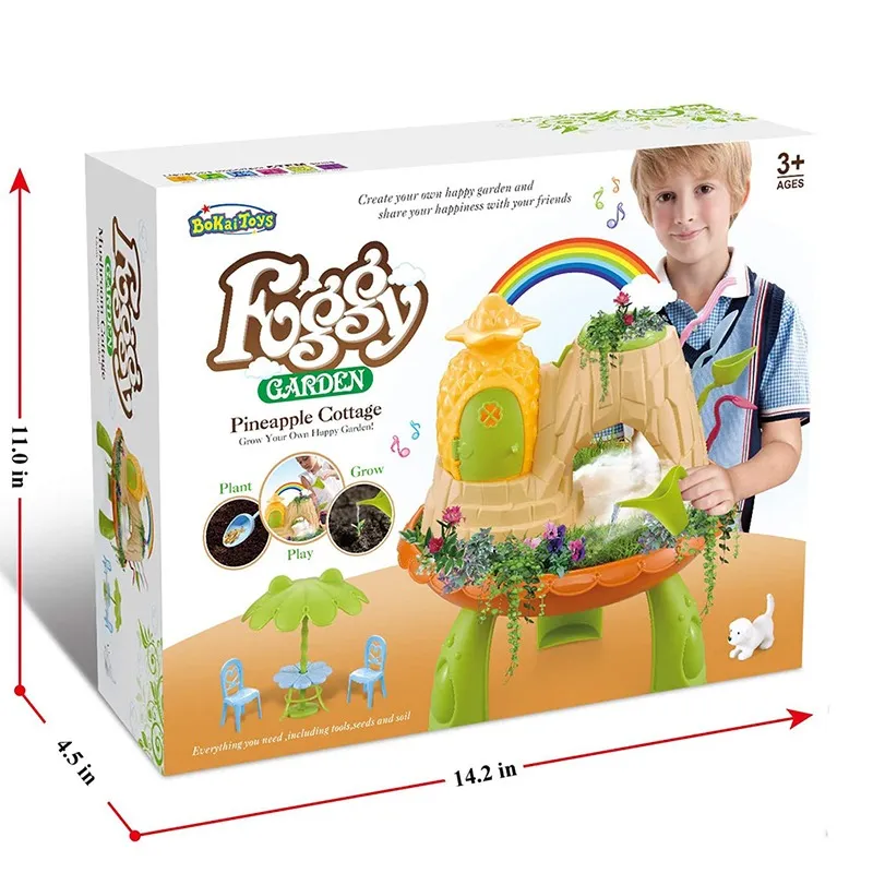 مجموعة حديقة منزل الاناناس فوجي جاردن. تشتمل مجموعة أدوات البستنة للأطفال على مجرفة ، لعبة الحديقة ، علبة مياه ، وعاء زهور ، منزل أناناس، قوس قزح ، طاولة مظلة ، 2 كرسي ، 5 مزيج البذور ، 1 تربة ، جرو. تأتي هذه الحديقة مع إضاءة ملونة وموسيقى، مما سيزيد من المرح من العروض البصرية والسمعية. تساعد الأطفال على تطوير المهارات الحركية الدقيقة والتفكير. – تتطلب 3 بطاريات من “AA” (غير متضمنة). الفئة العمرية المناسبة: 3+ فما فوق.