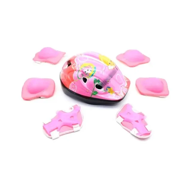 هذه مجموعة معدات حماية للأطفال مصممة للاستخدام في مختلف الرياضات ذات العجلات. يغلب على المجموعة اللون الوردي الزاهي. تتضمن خوذة ومجموعة كاملة من وسائد الحماية.