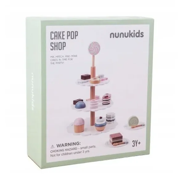 مجموعة حلويات أو مخبوزات خشبية للعب التظاهري، تتضمن عادةً حاملًا متعدد الطبقات وقطعًا خشبية متنوعة. تُشجع هذه المجموعة على اللعب التخيلي ولعب الأدوار، وتُساعد على تنمية المهارات الاجتماعية والإبداع.