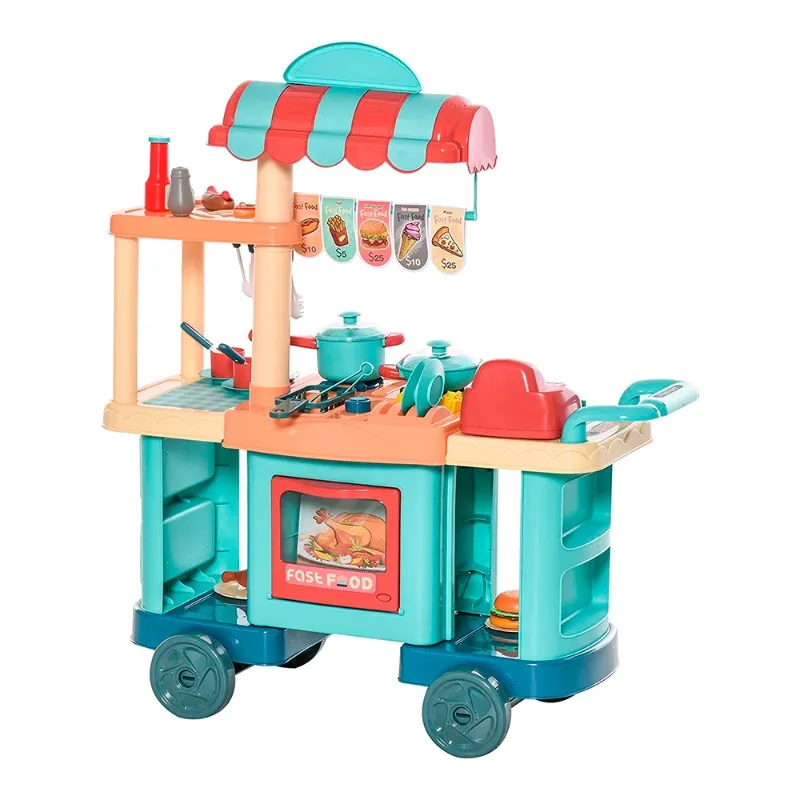 Fast Food Gourmet Food Cart Set. Cute colored fast food cart set for children. Cool and realistic cart to stimulate real life experience. Consists of several cooking utensils and ingredients. Mini cash register and coupons included too.