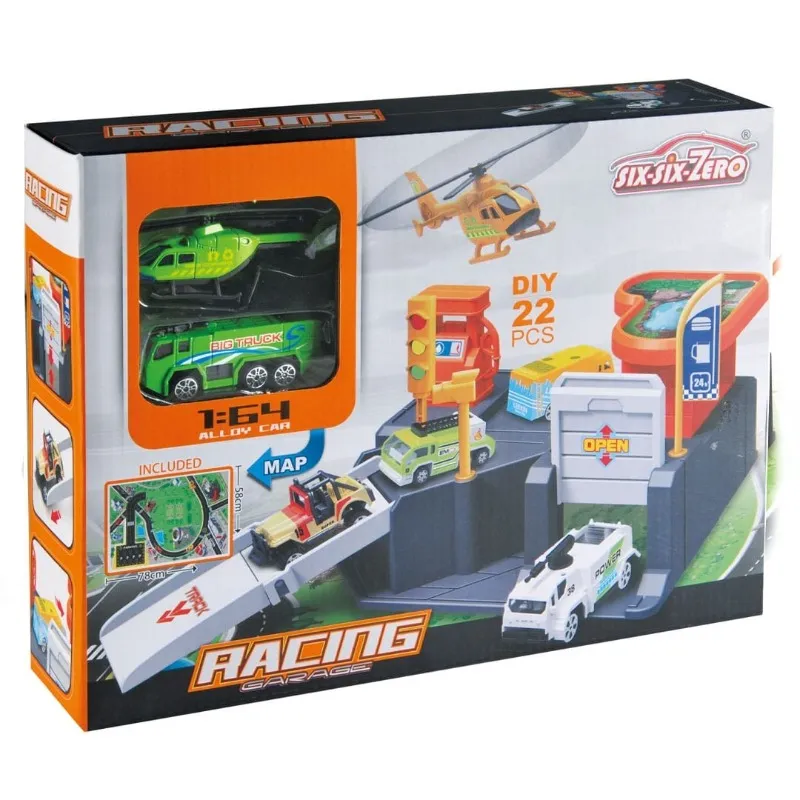 The station and parking lot contains 21 pieces, including a map, a helicopter, and various cars. Made of alloy and plastic. Helps develop hand-eye coordination and fine motor skills. Suitable age group: 3 years and above.
