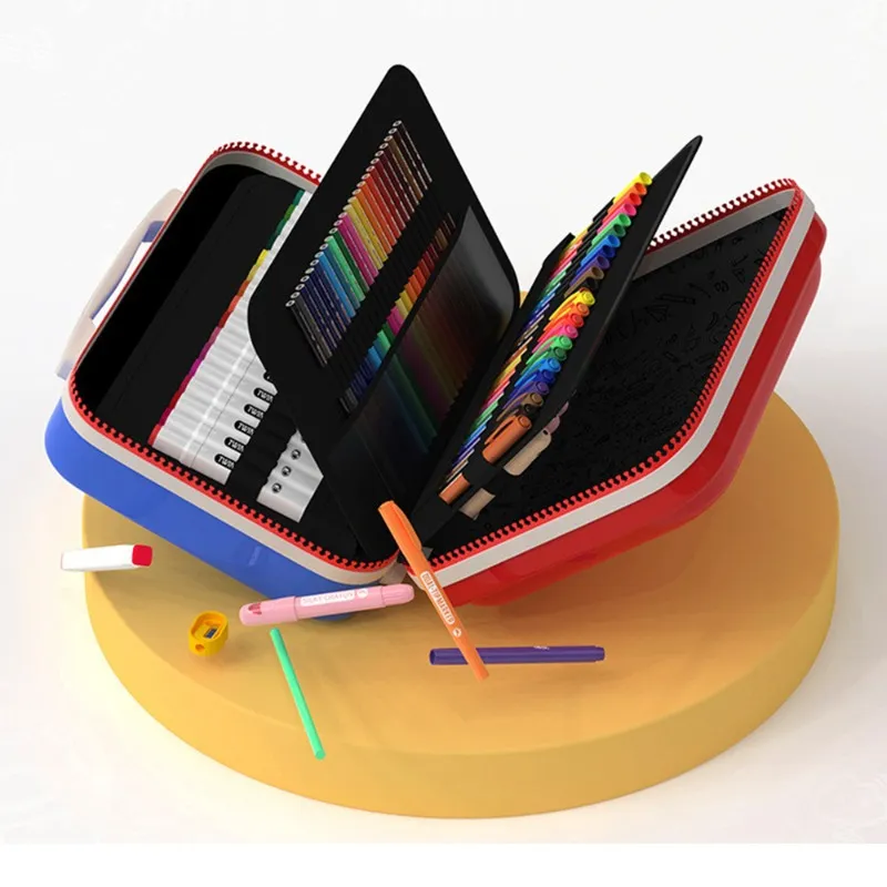 This art and coloring pencil case set contains a wide range of bright colors that help inspire children to express themselves and their imagination. The crayons can be washed easily. Contains 16 colors silk crayons, 12 watercolor pens, 12 double-headed ballpoint pens, 24 round wood colored pencils, 32 crayons, 8 pencils, 2 erasers and 2 sharpeners and other tools. Removable adhesive stickers. Brushes neatly arranged with 3-tier storage. – Easy to carry bag design.