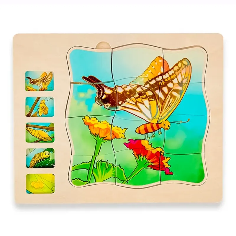 Wooden puzzle consisting of five layers. Complete the growth cycle of a butterfly with the four different puzzles.