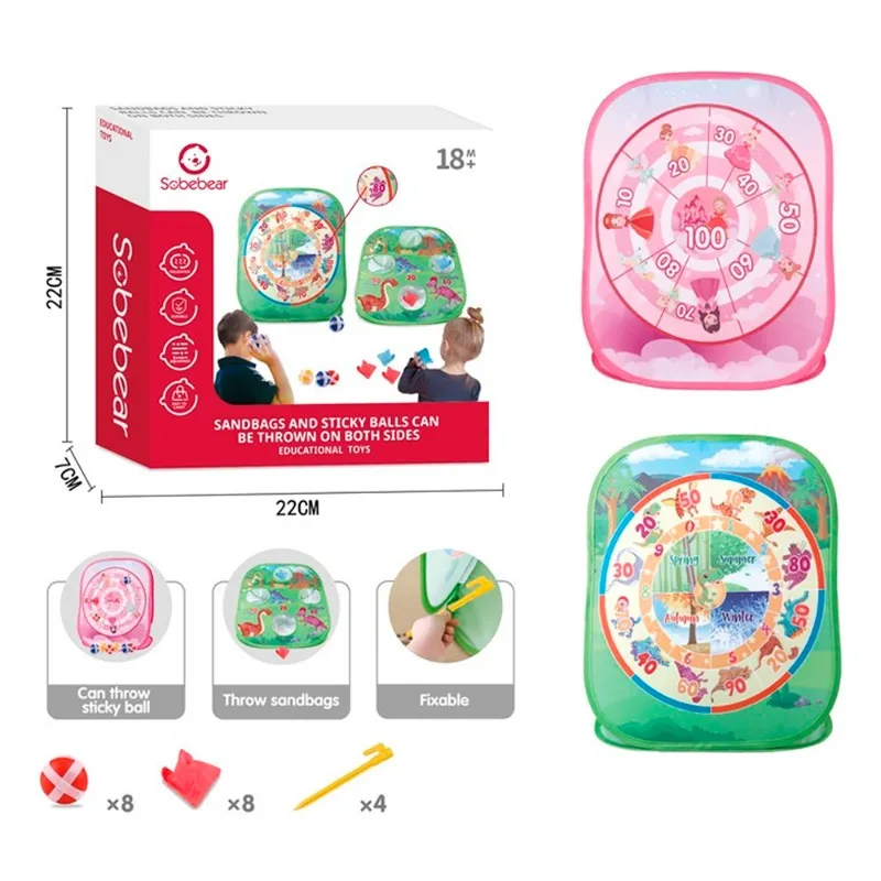 The front is a sandbag toy and the back is a sticky ball toy. Equipped with hook and loop fastener for dart board. It has strong adhesion and is not easy to disassemble. Can be folded for storage. Easy to carry when traveling.