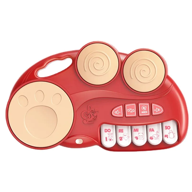 There are 3 illuminated buttons for the musical drums. The piano features 4 models. 5 animal sounds, 6 children’s songs, and 6 sound effects. Possibility of adjusting the volume level. Smooth surface for small child’s hands.