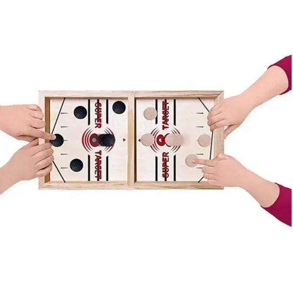 This is a portable, two-player wooden board game designed for fast-paced play, also known as “speed disc” or “finger hockey.” Design: It consists of a rectangular wooden frame surrounding the playing surface. How to play: The game has two opposing sides separated by a central barrier with a small opening.