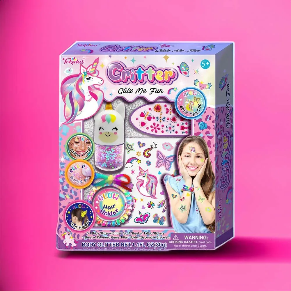 3-1 Body Glitter w/Critter Top. 1 Sheet of Tattoo Stickers. 1 Sheet of Patterned Gems. 1 Hair Holder ( Decorative Bracelet.