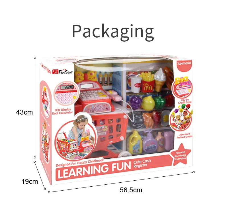 Cute Cash register1. Great register detail such as credit card swiping and conveyor belt to help improve hand-eye coordination and learn about shopping. 2. Funny Pretend Scanner, Press the button to scan the goods, coming with light sound effect. 3. Over 40 accessories including cookie fruit, coin, credit card and condiment to help children learn about the little things. 4. Real Calculator, There is a real calculator Inside the register which help improve children s math knowledge. 5. Large Drawer, Press the button to open the drawer to collect the money. 6. Shopping Trolley, Put the goods in the shopping trolley to pretend shopping in the supermarket