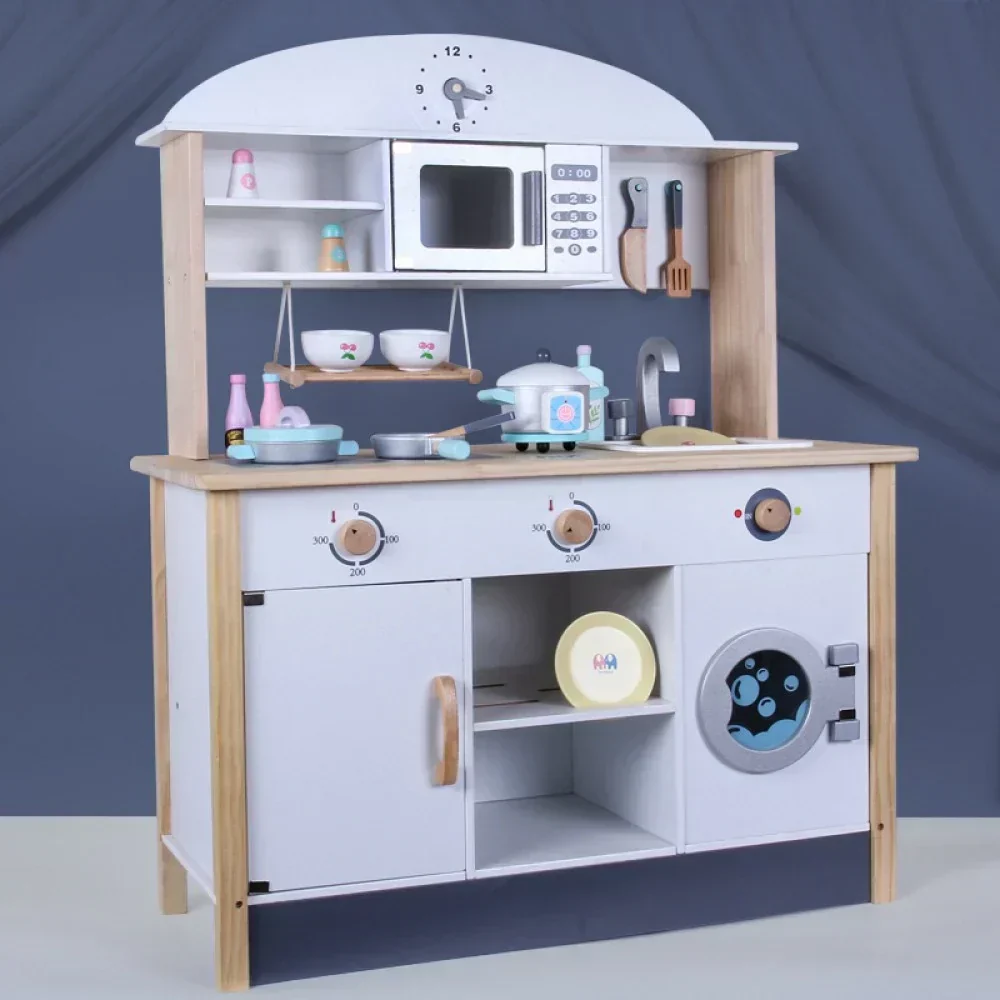 مطبخ خشبي للأطفال مع ملحقات مطبخ ألعاب مع ميكروويف وغسالة ومغسلة وموقد وأدوات طهي مطبخ خشبي للأطفال من سن 3 سنوات تفاصيل المنتج Realistic role play: Our children's kitchen is equipped with 2 stoves, 1 microwave, 1 tap, 1 sink and 1 washing machine for imaginative play. Children can pretend to use the microwave, cook meals, wash fruit or wash clothes for role play fun. ملحقات الطبخ المكونة من 15 قطعة: يحتوي مطبخ اللعب على 15 ملحقًا غنيًا للطهي، بما في ذلك طباخ أرز واحد، ومقلاة واحدة، ووعاء واحد بغطاء، وسكين واحد، وملعقة مسطحة واحدة، وملعقة مشقوقة، ووعاءين، وصحنين، ويقدم للأطفال أدوات مختلفة للعب. بالإضافة إلى ذلك، 1 × زيت زيتون، 1 × خل، 1 × نبيذ طهي، 1 × شاكر فلفل و1 × شاكر ملح توفر إمكانيات كافية للتذوق. بناء آمن ومستقر: مطبخنا الخشبي متين وآمن بما يكفي للأطفال الصغار للعب به. زوايا مستديرة تحمي الأطفال من الخدوش. بالإضافة إلى ذلك، تضمن الأرجل الخشبية الصلبة الاستقرار والاستقرار بشكل عام أثناء الاستخدام. توفر مساحة تخزين كبيرة: تحتوي لعبة المطبخ هذه على رف علوي واحد، ورف خشبي معلق واحد، وخزانة باب واحدة، ورففين علويين مفتوحين، ورففين سفليين، و3 خطافات معلقة. يمكن للأطفال إخفاء ملحقات المطبخ المختلفة بحرية وتعلم كيفية تنظيم أغراضهم بشكل جيد. هدية ممتعة وتعليمية: مطبخنا الخشبي للألعاب لا يمنح الأطفال ساعات من الفرح فحسب، بل يقدم أيضًا فوائد تعليمية وتنموية. أثناء عملية اللعب، يقوم الأطفال الصغار بتدريب مهاراتهم العملية ومعرفة المزيد عن مهارات الطبخ.