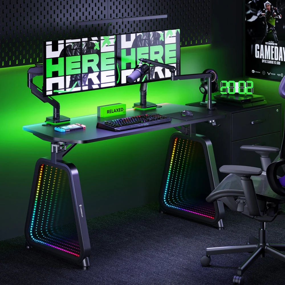 مكتب ألعاب Twisted Minds INFINITY بأرجل زجاجية RGB (120*60*75 سم) مكتب ألعاب Twisted Minds RGB INFINITY بأرجل زجاجية (120*60*75 سم)، وهو إضافة ثورية لإعداد الألعاب الخاص بك الذي يجمع بين الأسلوب والوظيفة والابتكار. تحديد: مادة: نسيج من ألياف الكربون تصميم: تصميم مستقبلي مع مرايا على الأرجل إضاءة: ضوء LED إنفينيتي إدارة الكابلات: نعم حامل الكأس: نعم ماوس اللابتوب: لوحة ماوس ممتدة مقاس: 120x60x75 سم نموذج #: TM-GMD12-D1 ماركة: عقول ملتوية وزن: 27. 000000 رطل وصف: قم بإضاءة محطة الألعاب الخاصة بك بالتوهج الساحر لمصباح Infinity LED، مما يخلق جوًا غامرًا يعكس أسلوب اللعب الخاص بك. ومن خلال التحكم البديهي في الإضاءة، يمكنك تخصيص الإضاءة لتناسب تفضيلاتك وحالتك المزاجية، مما يعزز تجربة اللعب بشكل عام. بأبعاد 120x60x75 سم، يوفر مكتب الألعاب هذا مساحة عمل واسعة ومريحة، مما يسمح لك بالانغماس بالكامل في مغامرات الألعاب الخاصة بك. قم بترقية إعداد الألعاب لديك باستخدام مكتب الألعاب Twisted Minds RGB INFINITY ذو الأرجل الزجاجية - حيث يلتقي الأسلوب مع الأداء الوظيفي، ويلتقي الابتكار مع الألعاب.
