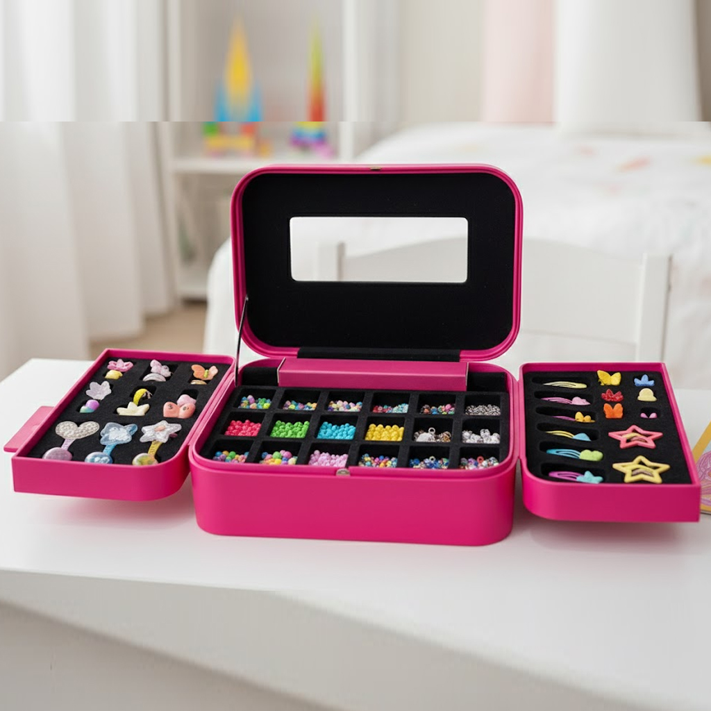 حقيبة الاكسسورات 👜مع 928 قطعة ♾️حقيبة سهلة التنقل الي اي مكان ✈️مع مرآة 🪞لون ذاهي و مناسب للاطفال و الكبار يمكن عمل اشكال اكسسورات مختلفة و متنوعة