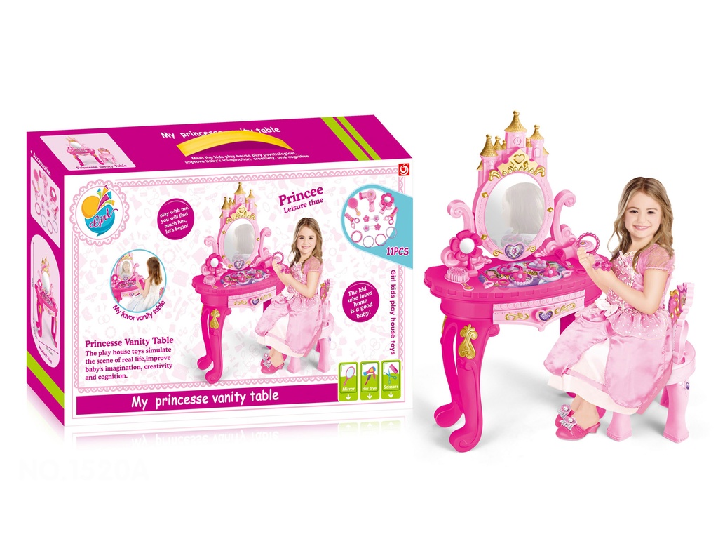 تسريحة البرنسيسةمع كرسيتحتوي على ادوات عدد 11 قطعة مرآةمصنوع من المواد الامنة على الاطفال