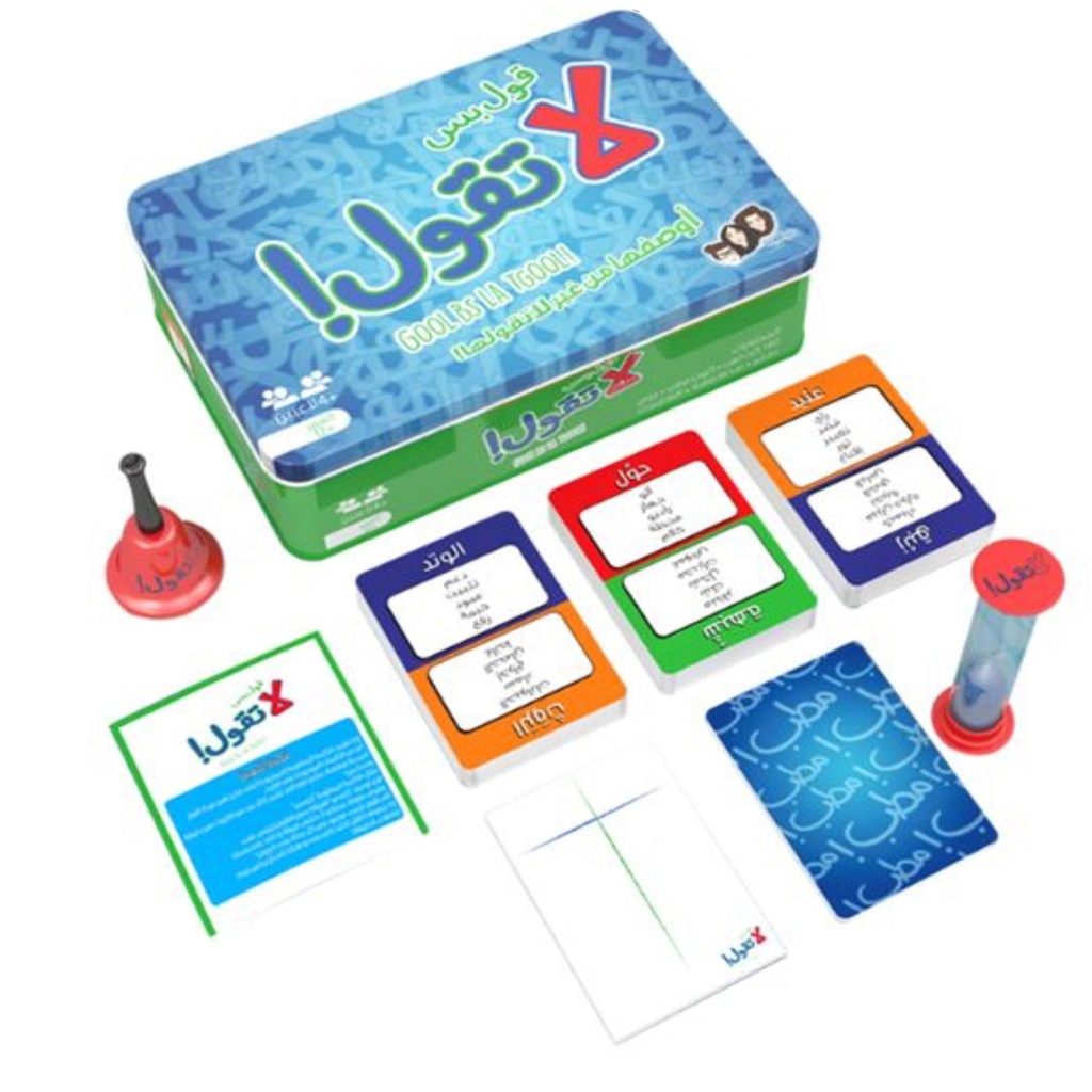 لعبة عائلية حماسية تتطلب مهارة في التعبير واستخدام الكلمات مع سرعة البديهة. تعتمد اللعبة على أن ينقسم اللاعبين إلى فريقين (أ، ب)، يقوم أحد أفراد المجموعتين بسحب بطاقة تحتوي على كلمة مطلوب شرحها بالإضافة لمجموعة من الكلمات التي يُمنع استخدامها بالشرح. والفريق الفائز هو الذي يستطيع شرح أكبر عدد من الكلمات من غير استخدام الكلمات الممنوعة وخلال دقيقة واحدة فقط لكل كلمة. ويرجى الإشارة إلى أن الشرح بلغة أخرى أو الشرح بحركات تعبيرية هو ممنوع بتاتًا.· تساعد على تنمية التركيز لدى الأطفال والكبار.· تساعد على تنمية قدرة الأطفال على استخدام الكلمات والتعرف على معانيها.· اللعبة مصنوعة من مواد آمنة وصديقة للبيئة.· تسمح بعدد أربعة لاعبين فما فوق.