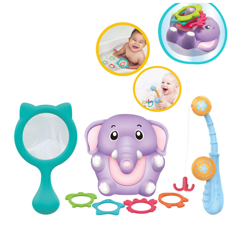 استمتع بلحظات من المرح والتفاعل مع ادوات الاستحمام1 المذهلة. تتضمن اللعبة فيلًا صغيرًا و بصنارة وشبكة، وتحتوي على أربع حلقات مطاطيةتجمع بين لعبة الصيد للأطفال ولعبة وضع الحلقات المائية على الفيل و شبكة لجمع الحلقات مصممة خصيصًا لتوفير تجربة استحمام ممتعة وتفاعلية للأطفال