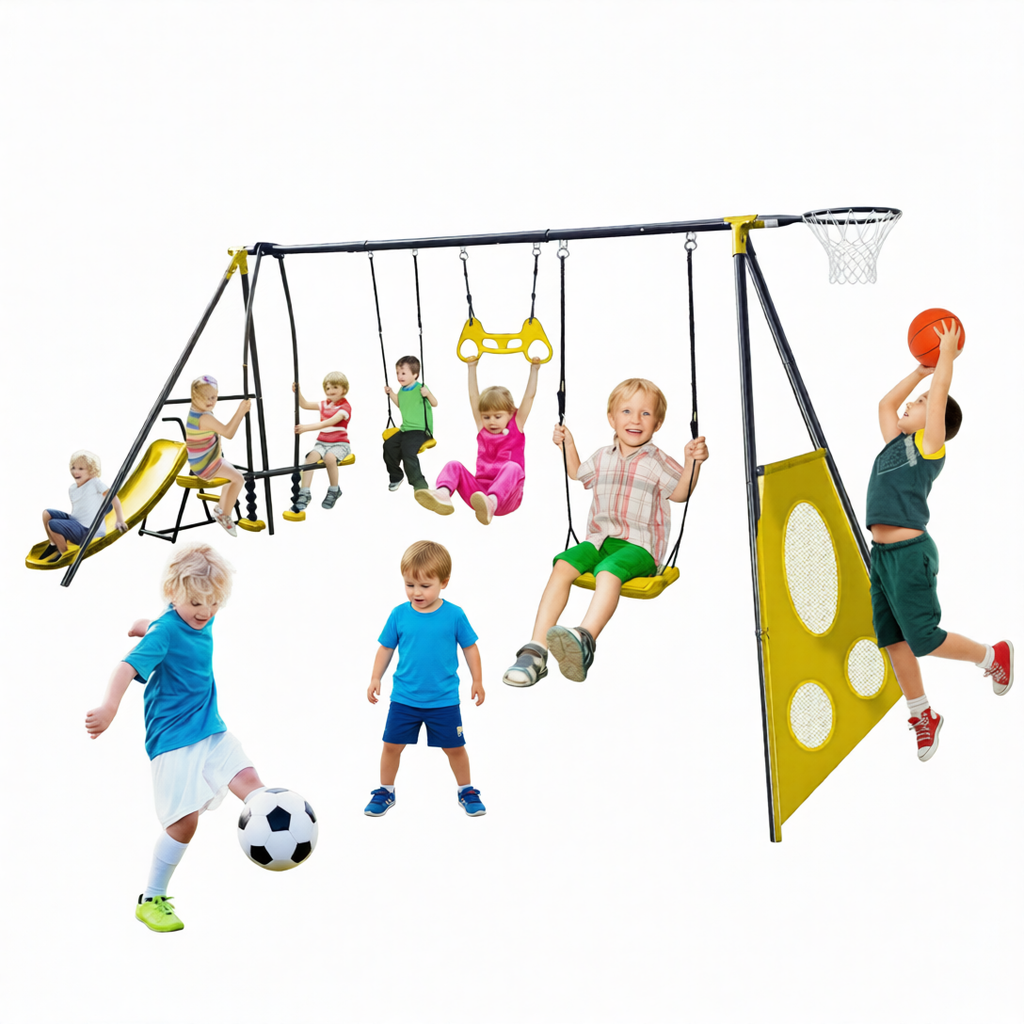 مجموعة ألعاب ممتعة للأطفال: تتضمن هذه المجموعة ما يصل إلى 7 ألعاب، مما يتيح لـ 7 أطفال الاستمتاع بوقتهم في ملعب خارجي كامل. تتميز بتنوعها حيث تشمل أرجوحتين فرديتين لتحقيق الإثارة والمرح، زحليقة لتجربة الانزلاق الرائعة، مرمى كرة لتطوير مهارات رمي الكرة، إطار كرة سلة لتحفيز روح التنافس، جمباز لتعزيز المرونة، وجاروف يوفر مكانًا مميزًا لمغامرات اللعب بشكل مشترك. المقاعد الأربعة للأرجوحة مصممة بعناية لتوفير راحة وأمان للأطفال، حيث تأتي مع غطاء سلسلة لحماية أيديهم الصغيرة خلال فترات اللعب. يُشدد على أنها مناسبة للاستخدام المنزلي ، مما يجعلها خيارًا آمنًا ومسليًا في فضاء الحديقة الخاصة بك. تتميز الزحليقة بتصميم من البلاستيك المتين، وتأتي مع منطقة هبوط آمنة لتعزيز تجربة الانزلاق بشكل مأمون. الهيكل الفولاذي المطلي بمسحوق يوفر المتانة والاستقرار للمجموعة، مما يجعلها استثمارًا مستدامًا لفترة طويلة من اللعب والمرح.