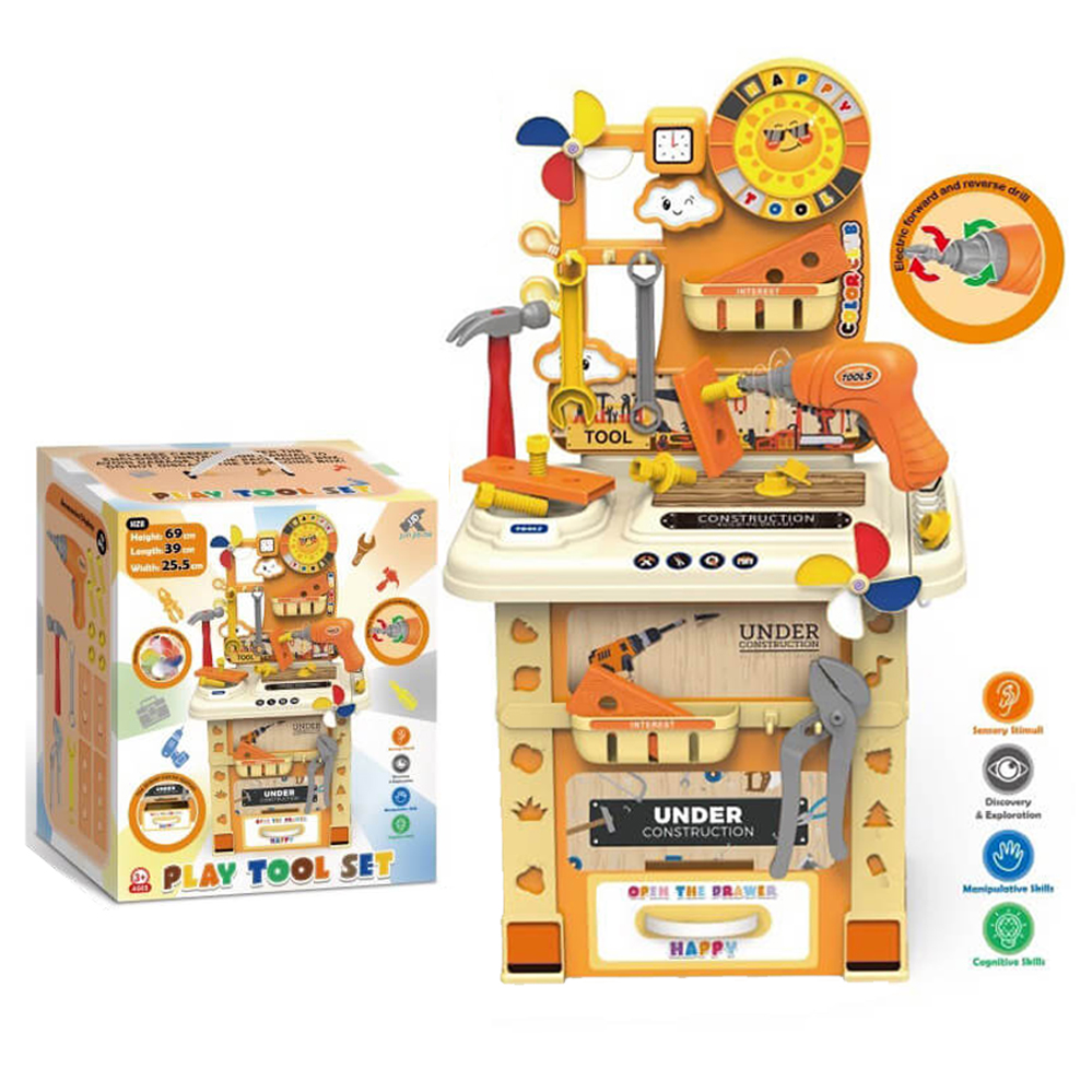 مجموعة أدوات الورشة الفنية"بيج ماستر" للحرفيين الصغار هي لعبة رائعة للأولاد الذين يستمتعون بإصلاح الأجهزة والسيارات وغيرها من الآلات. تحتوي المجموعة على: مثقاب واقعي للغاية يعمل بالبطارية، يدور في اتجاهين (فك وربط).أدوات إصلاح (مطرقة ومفتاح ربط، منشار، مفكات براغي، مربع، إلخ.)يمكن فتح الدرج لوضع جميع الأدوات بسهولة. أبعاد الورشة: الارتفاع: 69 سم - الطول: 39 سم - العرض: 25. 5 سم. المجموعة في علبتها الأصلية، ما يجعلها هدية مثالية.