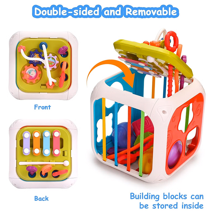 مكعب الأنشطة الحسية والتعليمية 7 في 1 للأطفال – مركز متكامل لتنمية المهارات امنح طفلك تجربة لعب غنية ومحفزة مع مكعب الأنشطة الحسية متعدد الأوجه هذا، المصمم ليقدم 7 ألعاب تعليمية في منتج واحد مدمج. هذا المكعب هو رفيق مثالي لتنمية المهارات الأساسية لدى الأطفال الصغار، من المهارات الحركية الدقيقة إلى التعرف على الأشكال والتفكير المنطقي. المواصفات والميزات الرئيسية: • تصميم 7 في 1 متعدد الأوجه: يوفر المكعب ستة أوجه نشطة بالإضافة إلى ميزة التخزين الداخلية، مما يجعله مركزًا شاملاً للعب والتعلم: o أعلى المكعب: لوحة أنشطة قابلة للإزالة ومتعددة الأنشطة، تتضمن متاهة خرزية سلكية (bead maze) مع خرزات ملونة ومتحركة، تروس دوارة، وأشكال تفاعلية للضغط والتحريك. هذه اللوحة يمكن فصلها لتُستخدم بشكل مستقل. o الجوانب: §فرز الأشكال (Shape Sorting Box): جانب به فتحات بأشكال هندسية (قلب، مثلث، مربع، نجمة) لمطابقة الأشكال وتنمية الإدراك البراغي والتنسيق. §أشرطة مطاطية ملونة: جانب مزود بأشرطة مرنة عمودية تسمح للأطفال بدفع الكرات/الأشكال الملونة للداخل والخارج، مما يعزز مهارات حل المشكلات والتنسيق بين اليد والعين. §عصا دفع الأوتار §القرع على البيانو §رؤوس دوارة §تروس دوارة • أشكال حسية متنوعة: يتضمن مجموعة من الكرات والأشكال الحسية بألوان وأشكال مختلفة يمكن إدخالها وتخزينها داخل المكعب. • وظيفة تخزين ذكية: يمكن تخزين الكرات والأشكال (مثل مكعبات البناء الصغيرة) داخل المكعب بعد اللعب، مما يساعد في الحفاظ على التنظيم وتوفير المساحة. • لوحة علوية مزدوجة الوجه وقابلة للإزالة: الجزء العلوي من المكعب يتميز بلوحة مزدوجة الوجه يمكن قلبها لإظهار أنشطة مختلفة (مثل بيانو القرع) ويمكن إزالتها كليًا. • أبعاد المنتج: o الطول: 18. 5 سم o العرض: 18. 5 سم o الارتفاع: 14. 8 سم (أبعاد الصندوق: 15 سم × 15 سم × 14. 8 سم).