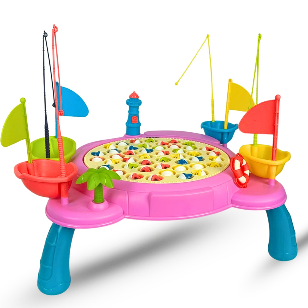 طاولة ملونة مع تصميم جذاب للأطفال مع إضاءه وموسيقى لاضافة مرح ومتعه. أسماك متحركة تضيف جوًا من التحدي والإثارة مزودة بعصي صيد صغيرة لالتقاط الأسماك تنمي مهارات التركيز والتنسيق بين العين واليد