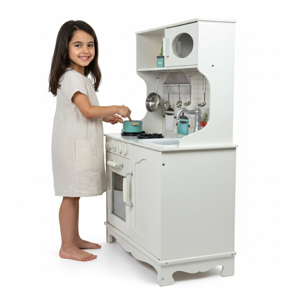 مطبخ خشبي مع ادوات-ابيض طلاء أنيق على المقابض والمقابض ، تفتح الأبواب وتغلق رف علويموقد ميكروويف ، حوض ، صنبور ، موقد مزدوج. اضاءة صوت النار والطبخ مناسب لعمر 3 سنوات وما فوق .