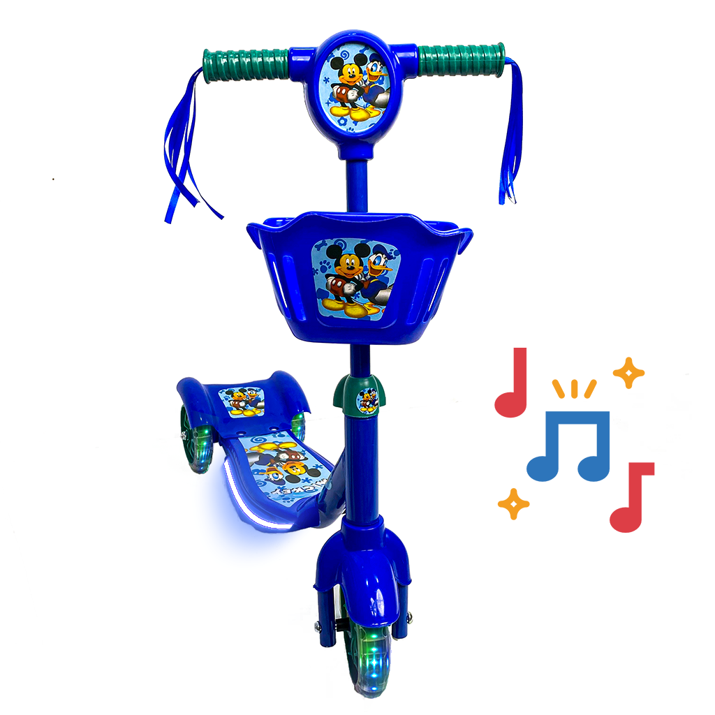 اسكوتر شخصيات ( مناسب لعمر سنه ونصف حتى عمر ثلاث سنوات ونصف ) يأتي بخمسة أشكال واللوان - اللون الازرق بشخصية ميكى ماوس - اللون الاحمر مع الازرق بشخصية سبايدر مان - اللون الوردي الفاتح بشخصيات اميرات ديزنى - اللون الوردي الداكن بشخصية مينى ماوس - اللون البنفسجى بشخصيات فروزين - يأتى مع اضاء قوية فى التايرات والجزء السفلى من الاسكوتر - سلة قوية ومميزة لحفظ الاغراض - موسيقى جميلة تضيف جوا من المرح للتجربة