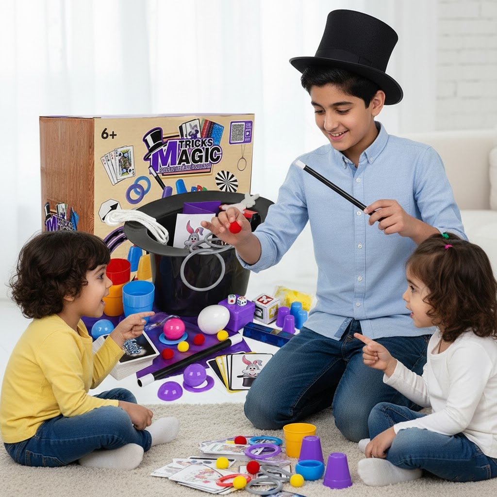 قبعة الألعاب السحرية عبارة عن مجموعة رائعة لتتعلم كيف تصبح ساحرًا حقيقيًا. تسمح لك مجموعة الساحر هذه بتعلم وتنفيذ خدعة سحرية مختلفة لإبهار الأصدقاء أو العائلة. يتضمن العديد من الملحقات لأداء الحيل السحرية.