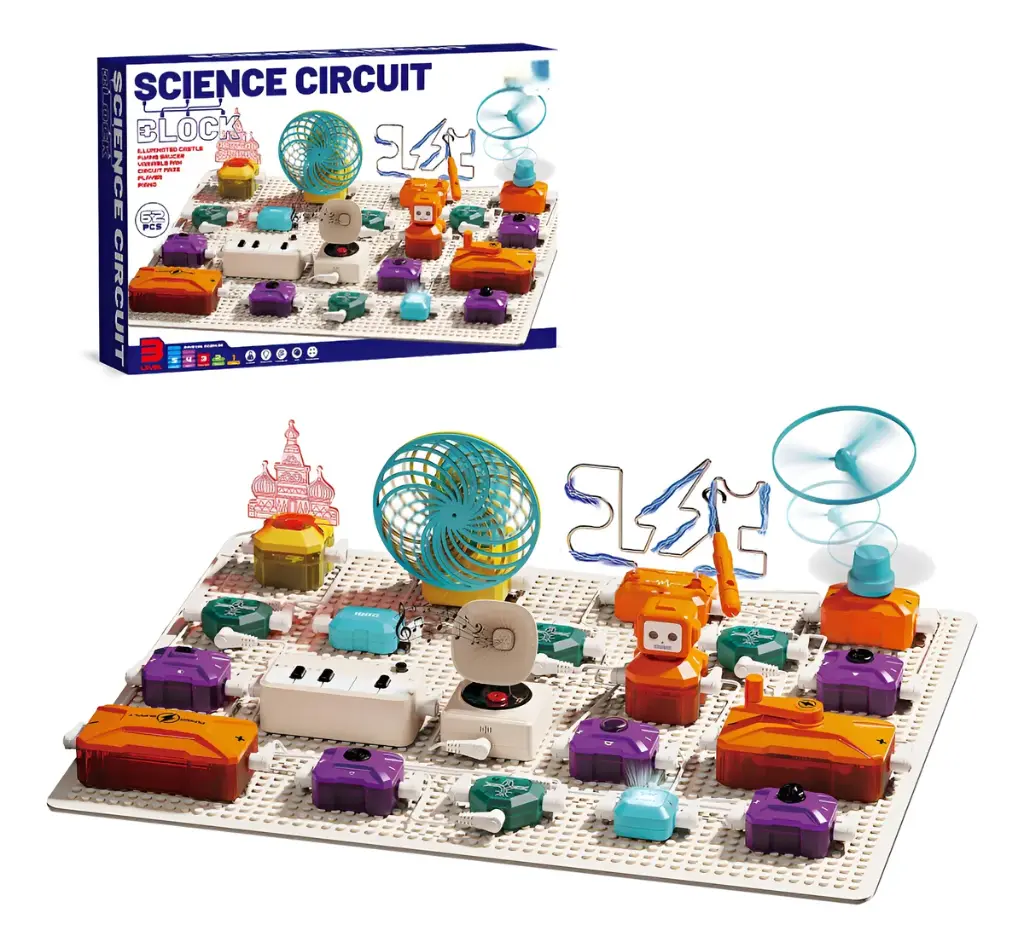 مختبر الدوائر الإلكترونية (62 قطعة) تجارب تفاعلية: تشمل مروحة طائرة، بيانو موسيقي، وإضاءات ذكية. تطوير المهارات: تنمي الذكاء الهندسي وروح الابتكار لدى المخترع الصغير. آمنة وسهلة: قطع متينة سهلة التركيب مصممة للأعمار من 3 سنوات فما فوق.