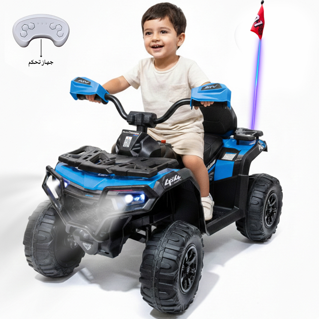 باقى أطفال كهربائي بتصميم واقعي وقوي، مزود بإضاءة أمامية وجهاز تحكم عن بُعد للأهل. يتميز بعجلات ضخمة للطرق الوعرة، ويتوفر بلونين حيويين: الأزرق والأسود، والوردي والأسود.