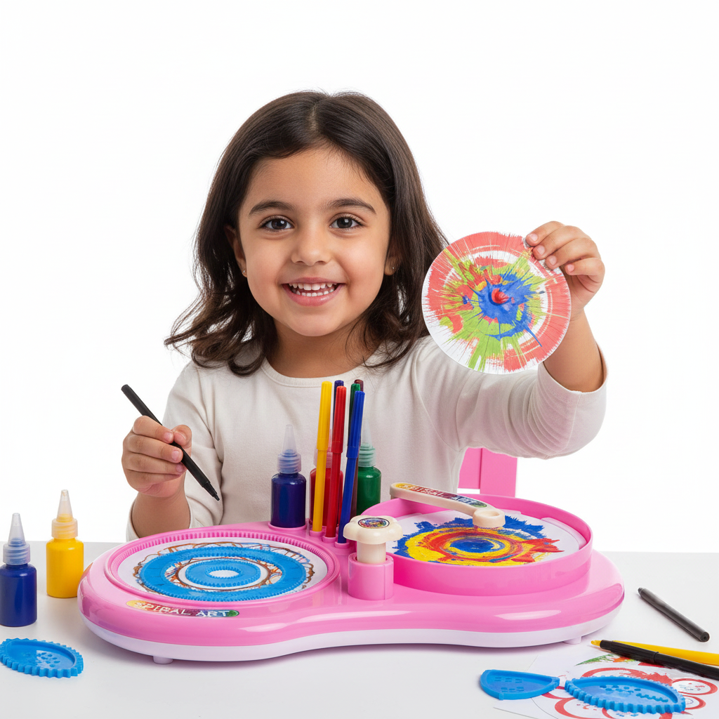 لعبة فن الأشكال اللولبية والألوان (Spiral Art)، تتيح للطفل ابتكار لوحات فنية مذهلة ودمج الألوان بطريقة إبداعية تنمي الحس الفني والتركيز لديه. تتضمن الجهاز الدوار، مجموعة أصباغ سائلة، أقلام تلوين، وتروس هندسية لعمل تصاميم لا نهائية، وهي مصنوعة من مواد آمنة تماماً ومناسبة للأعمار من 5 سنوات وفوق
