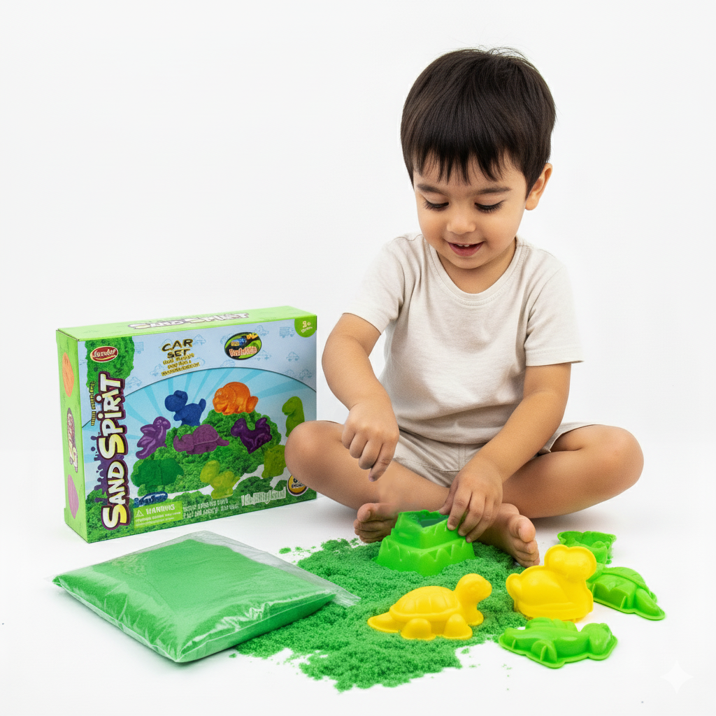 لعبة الرمل السحري (Sand Spirit) باللون الاخضر الممتع، توفر للطفل تجربة حسية فريدة للعب بالرمل داخل المنزل بدون فوضى وتنمي مهاراته الإبداعية واليدوية. تحتوي المجموعة على رمل اخضر ناعم سهل التشكيل مع قوالب متنوعة وأدوات نحت لابتكار مجسمات مختلفة، وهي مصنوعة من مواد آمنة لا تجف، ومناسبة للأطفال من عمر 3 سنوات وفوق.