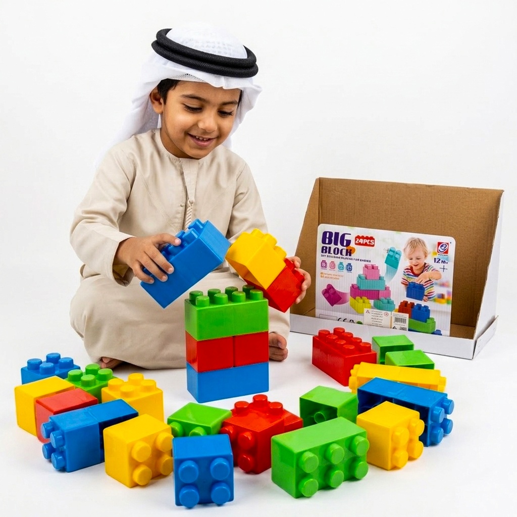 مجموعة مكعبات البناء الكبيرة (Big Block) الملونة، تمنح الطفل فرصة للإبداع والابتكار من خلال تركيب أشكال هندسية متنوعة، مما ينمي عنده المهارات الحركية والتنسيق بين اليد والعين. تحتوي المجموعة على 24 قطعة من المكعبات الضخمة سهلة الإمساك والتركيب، وهي مصممة بألوان زاهية تجذب الانتباه ومصنوعة من مواد آمنة تماماً، ومناسبة للأطفال من عمر سنة وفوق.