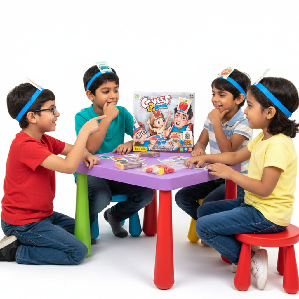 لعبة "Guess What" التفاعلية للأطفال (4+ سنوات)، تتضمن عصابات رأس وبطاقات صور متنوعة لتنمية مهارات التفكير والاستنتاج.