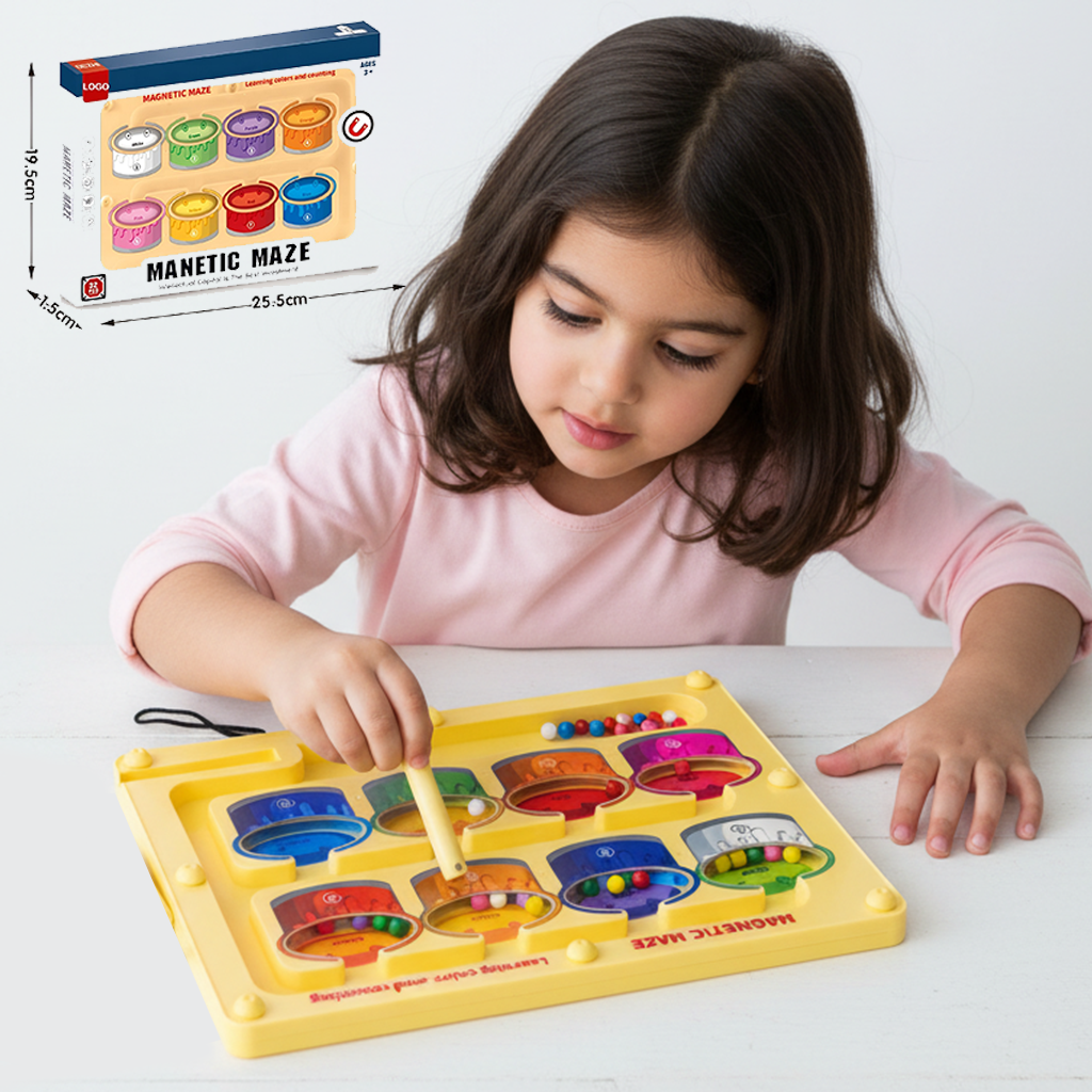 Gemini said لعبة ""Magnetic Maze"" التعليمية للأطفال (3+ سنوات)، تساعد في تعلم الألوان والعد باستخدام قلم مغناطيسي لتحريك الكرات الملونة داخل المتاهة.