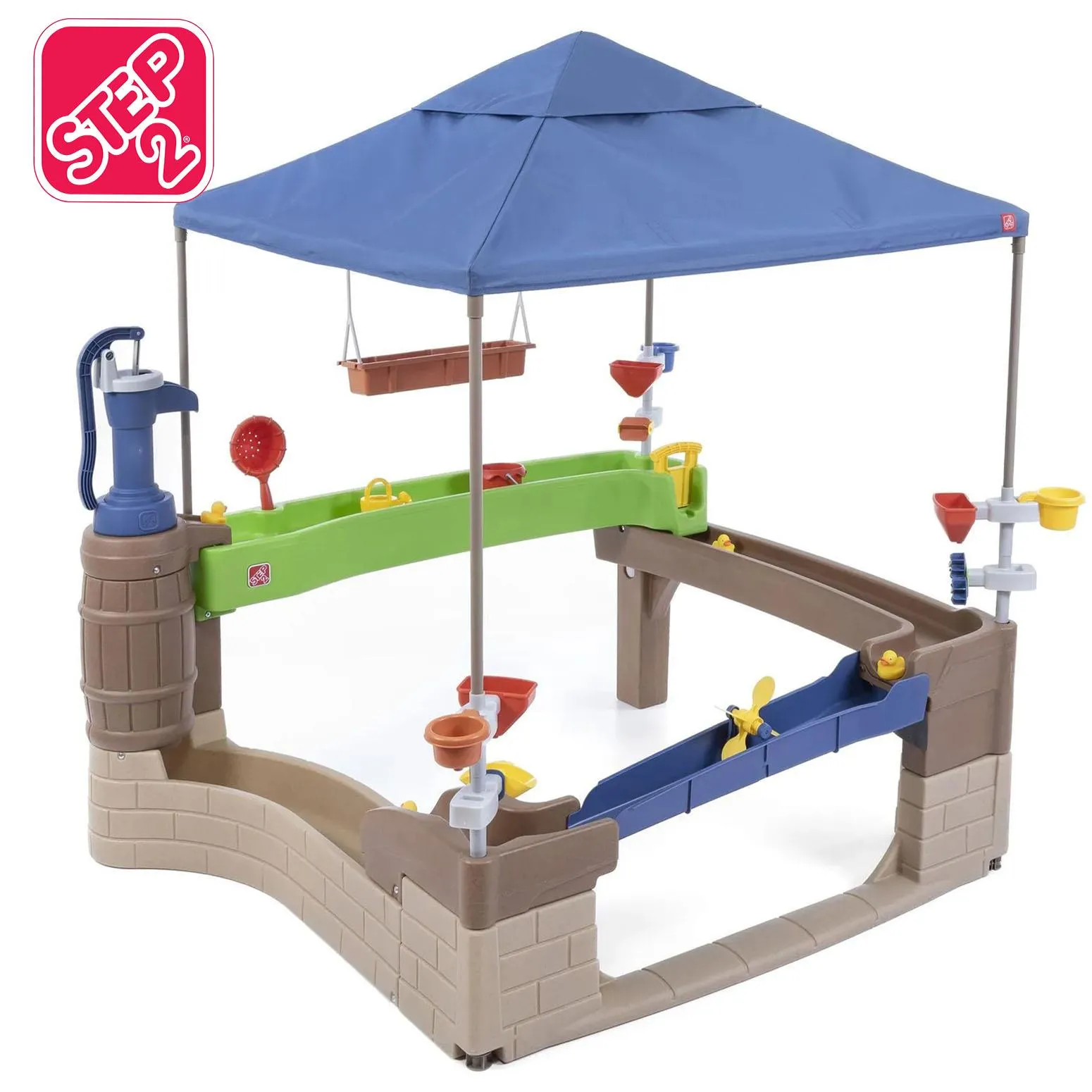 The Pump & Splash Shady Oasis™ is an outdoor water activity center packed with tons of water play stations to explore! The pavilion-style design encourages little ones to explore and discover water play through lots of fun activities while shaded under the large market-style canopy. Fill the large water reservoir - it holds up to 7 gallons (26. 5 L) of water - and get the water flowing with the working water pump. Kids can enjoy activities like the corner-mounted water maze funnels teet...